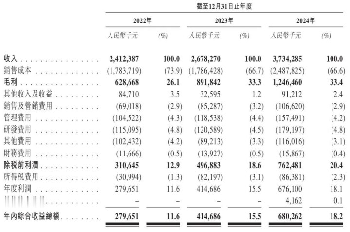 招股书表示,广合科技2022年、2023年、2024年营收永别为24.1亿元、26.78亿元、37.34亿元;毛利永别为6.29亿元、8.92亿元、12.46亿元;毛利率永别为26.1%、33.3%、33.4%。