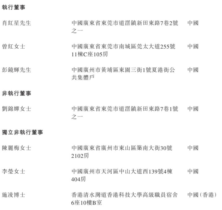 广合科技推行董事永别为肖红星、曾红女士、彭镜辉;非推行董事为刘锦婵女士,寂寞非推行董事永别为陈丽梅女士、李莹女士、施凌博士。