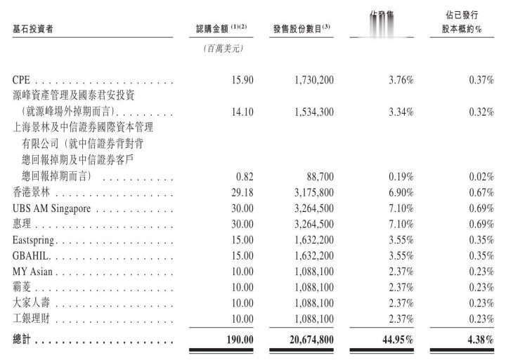 广合科技基石投资者永别为CPE、源峰财富惩处及国泰君安投资(就源峰场外掉期而言)、上海景林及中信证券国外成本惩处有限公司(就中信证券背对背总酬报掉期及中信证券客户总酬报掉期而言)、香港景林、UBS AM Singapore、惠理、Eastspring、GBAHIL、MY Asian、霸菱、人人东说念主寿、工银搭理,一共认购1.9亿好意思元。